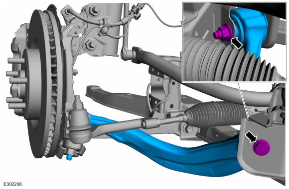 NOTICE: Tighten the suspension fasteners with the weight of the vehicle on the wheels and tires or use a suitable jack to raise the suspension to curb height or damage to the bushings may occur.